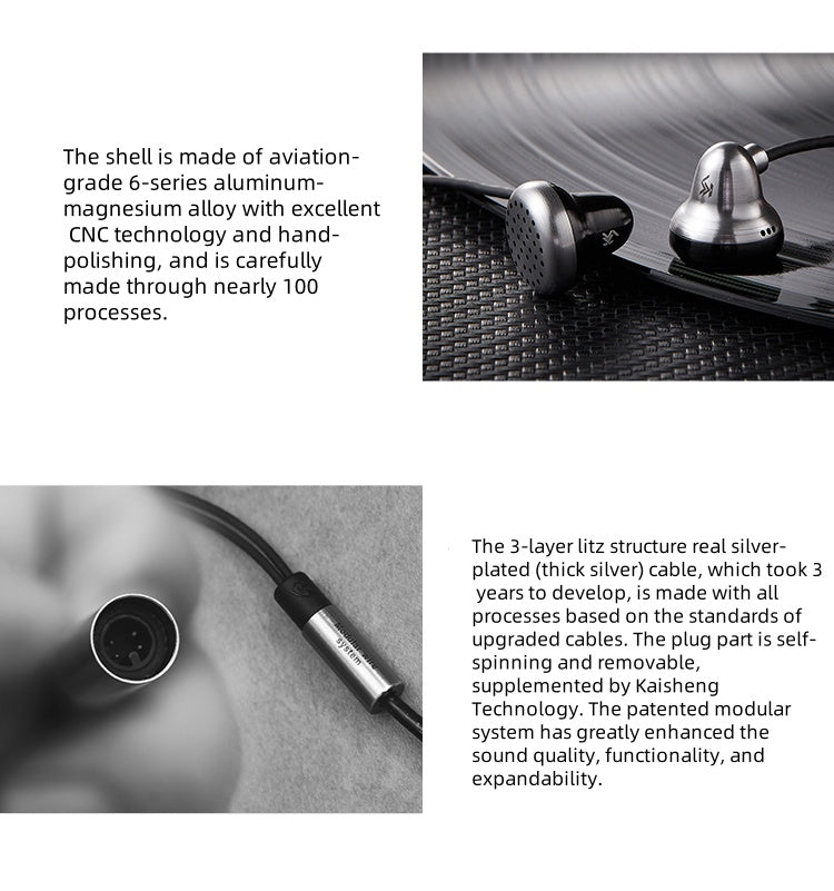The 3-layer litz structure real silver-plated (thick silver) cable,which took 3years to develop, is made with allprocesses based on the standards ofupgraded cables. The plug part is selfspinning and removable,supplemented by KaishengTechnology.The patented modularsystem has greatly enhanced thesound quality,functionality, andexpandability.