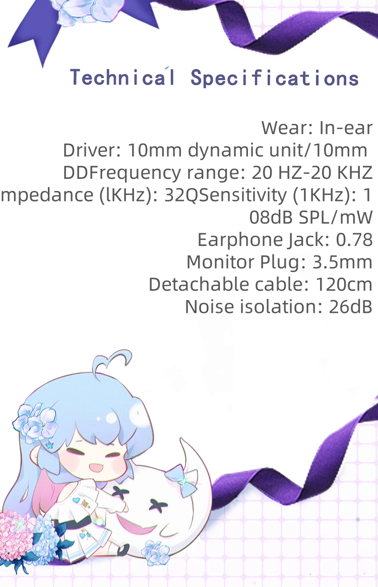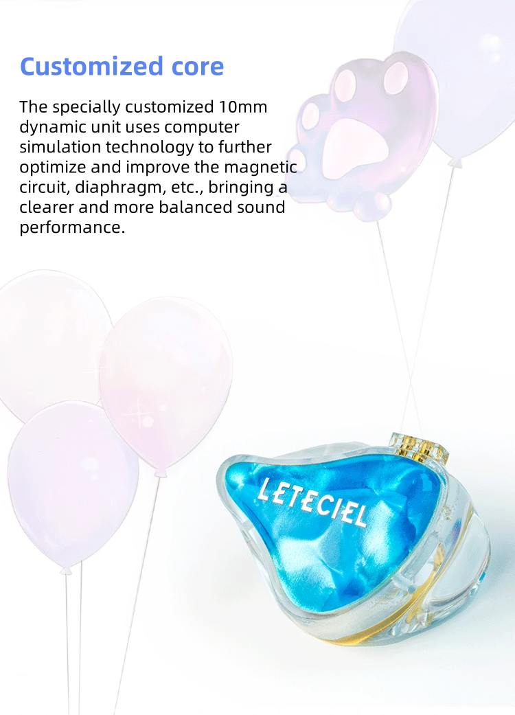 The cavity is made of medical-grade resin, with an ergonomic in-eardesign that fully fits the ear canal of most people. it is light andcomfortable to wear and not easy to slip off. Based on the air pressurebalanced low-frequency front cavity acoustic structure design,combined with computer simulation technology, the internal structureis further optimized to provide a more excellent sound experience.Selected high-purity oxygen-free copper silver-plated headphone wire,a pure design consistent with the appearance of the headphone. Thewire body is soft, with extremely low stethoscope effect, strongtoughness and durability.