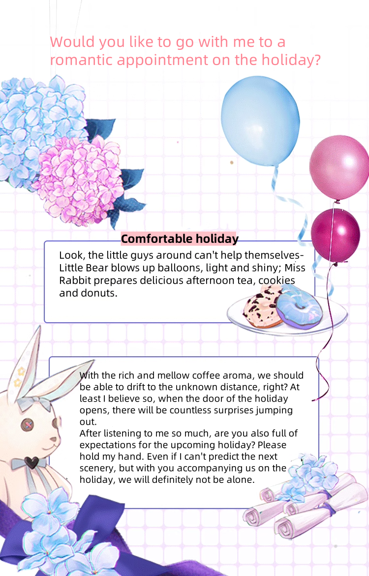 With the rich and mellow coffee aroma, we shouldbe able to drift to the unknown distance, right? Atleast i believe so, when the door of the holidayopens, there will be countless surprises jumpingout.After listening to me so much, are you also full ofexpectations for the upcoming holiday? Pleasehold my hand. Even if I can't predict the nextscenery, but with you accompanying us on theholiday, we will definitely not be alone.