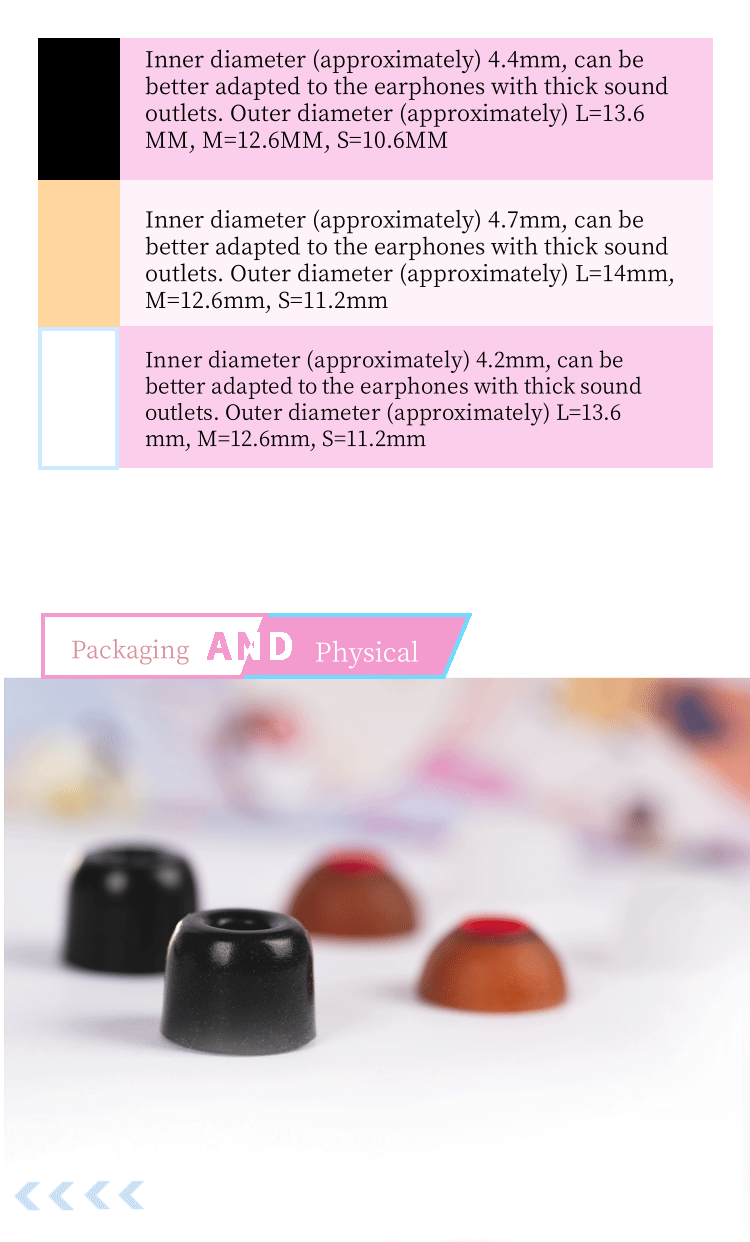 BLACK:Inner diameter (approximately)4.4mm, can bebetter adapted to the earphones with thick soundoutlets.Outer diameter (approximately)L=13.6MM,M=12.6MM,S=10.6MM