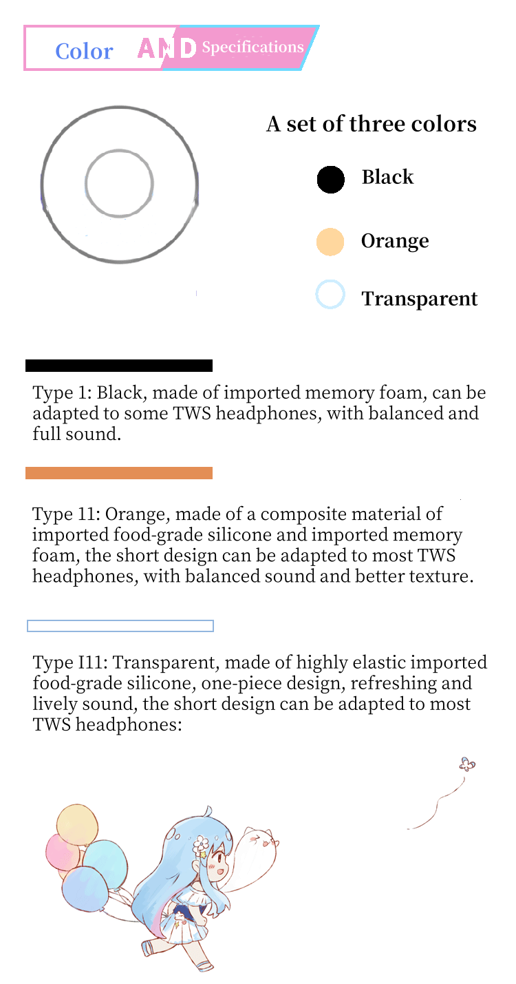 Type l: Black, made of imported memory foam, can beadapted to some TWS headphones, with balanced andfull sound.