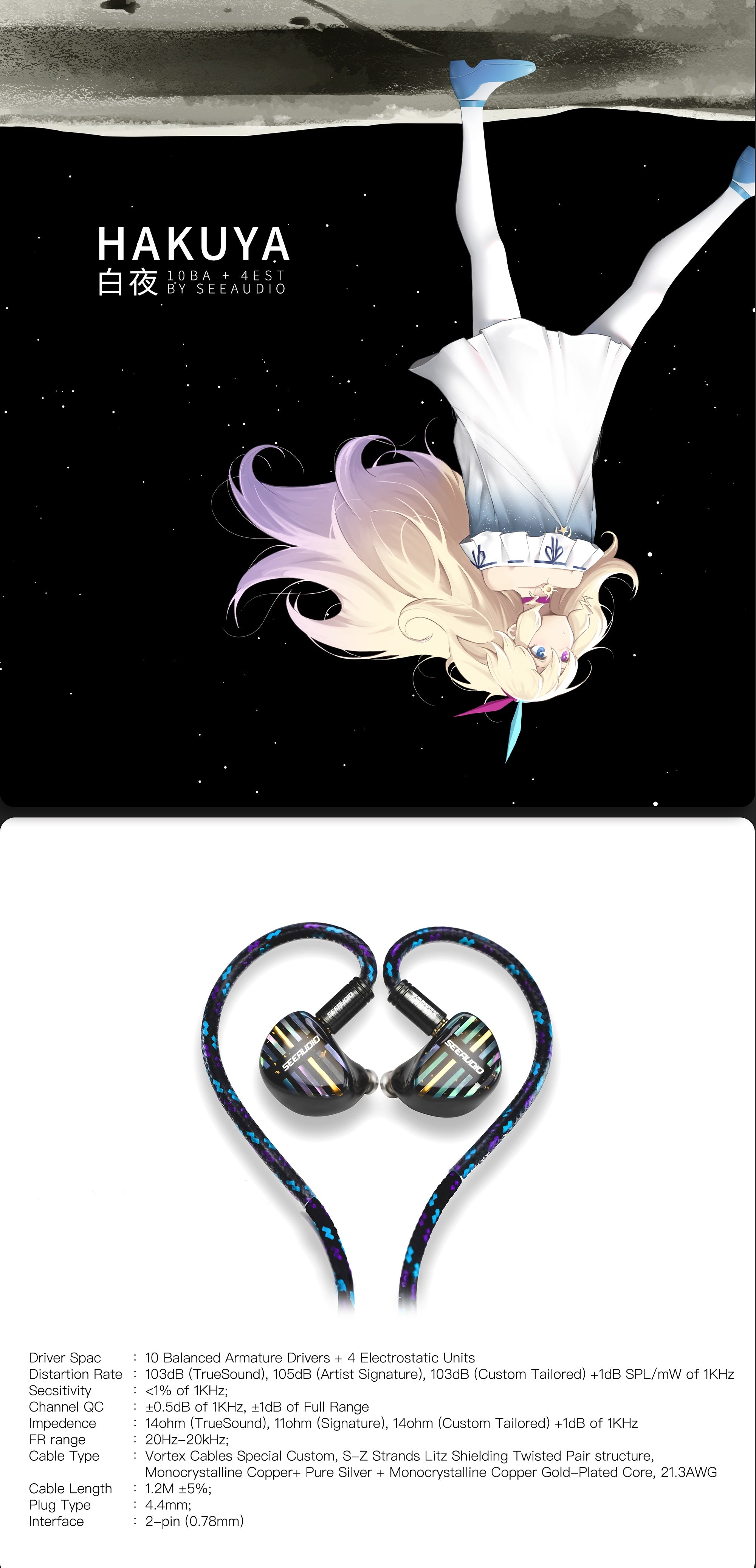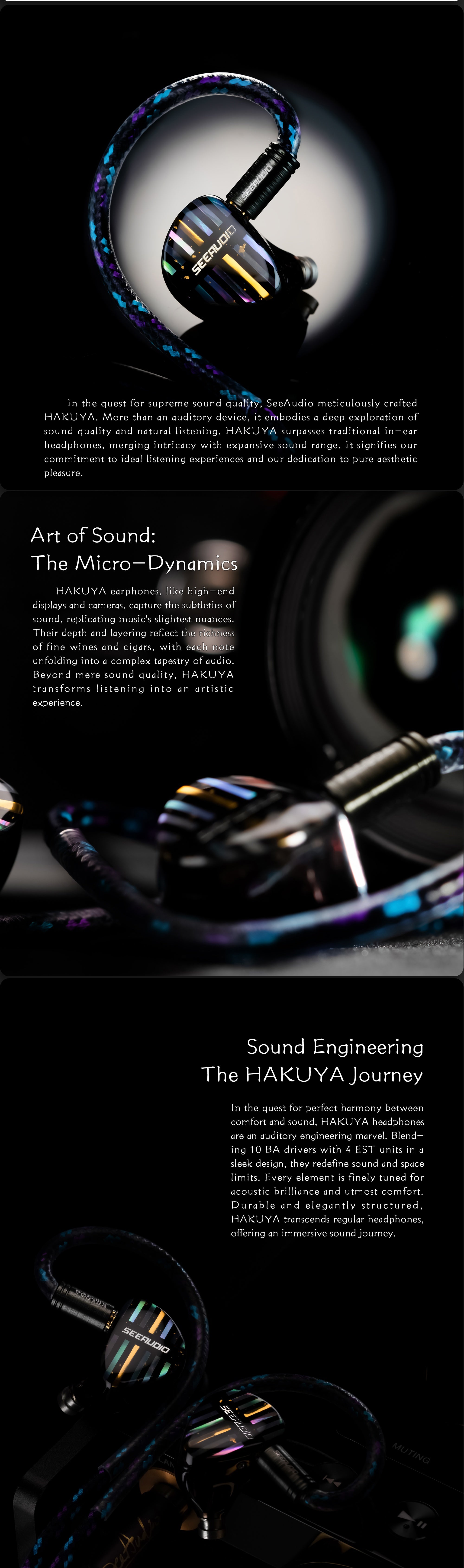 In the quest for perfect harmony betweencomfort and sound, HAKUYA headphonesare an auditory engineering marvel. Blending 10 BA drivers with 4 EST units in asleek design, they redefine sound and spacelimits. Every element is finely tuned foracoustic brilliance and utmost comfort.Durable and elegantly structured,HAKUYA transcends regular headphones,offering an immersive sound jourey.