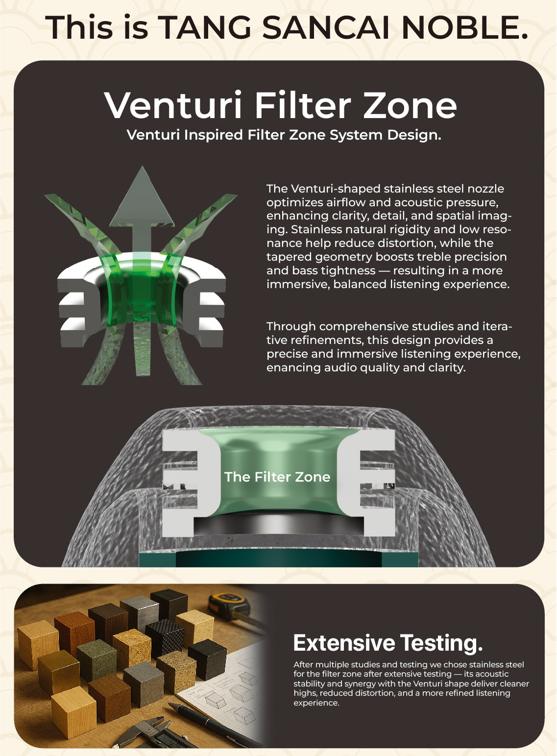 The Venturi-shaped stainless steel nozzleoptimizes airflow and acoustic pressure,enhancing clarity,detail,and spatial imaging.Stainless natural rigidity and low reso,nance help reduce distortion, while thetapered geometry boosts treble precisionand bass tightness-resulting in a moreimmersive, balanced listening experienee,