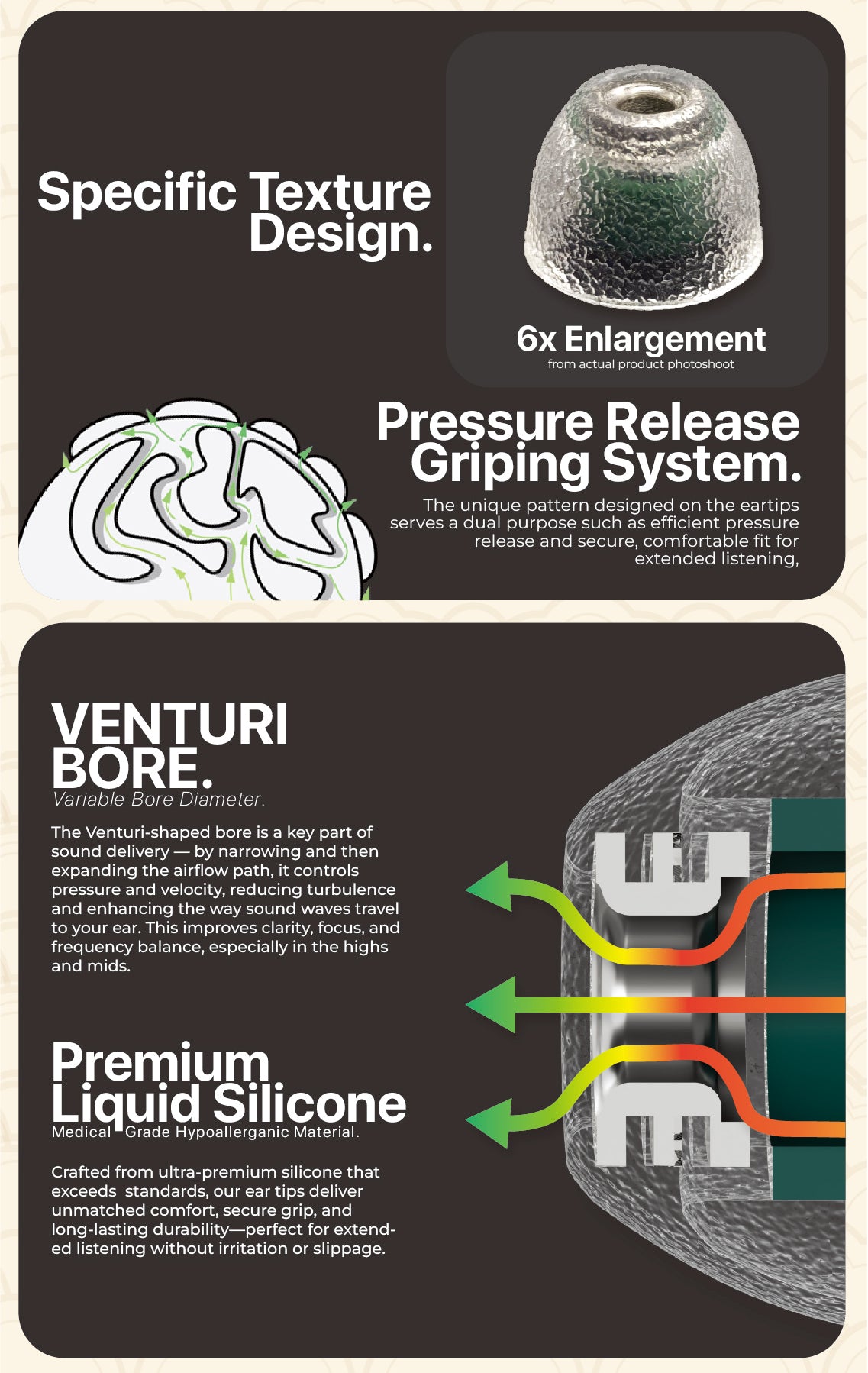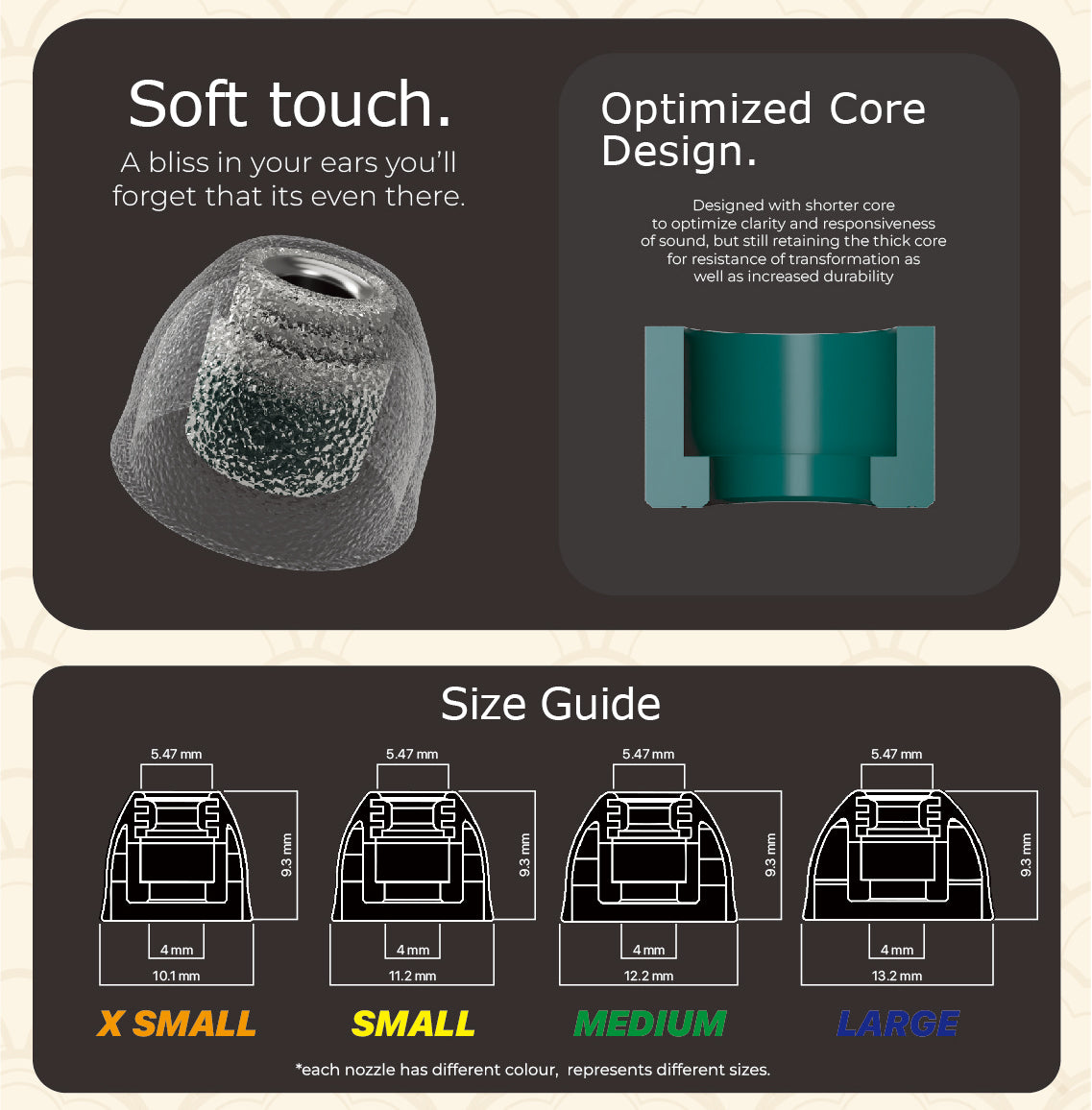 Crafted from ultra-premium silicone thatexceeds standards, our ear tips deliverunmatched comfort, secure grp, andlong-lasting durability-perferct for extend.ad listening without irritation or slippage.