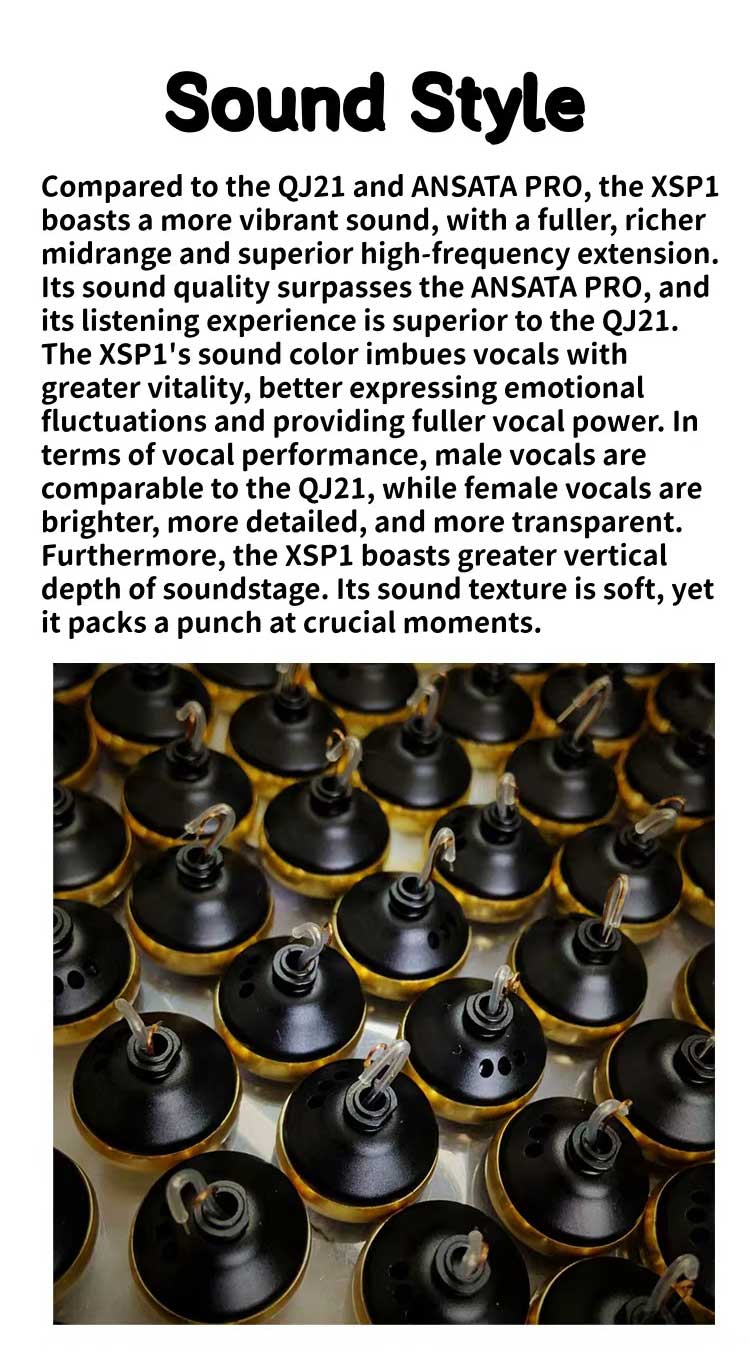 Compared to the QJ21 and ANSATA PRO, the XsP1boasts a more vibrant sound, with a fuller, richermidrange and superior high-frequency extension.Its sound quality surpasses the ANSATA PRO, andits listening experience is superior to the QJ21.The XSP1's sound color imbues vocals withgreater vitality, better expressingemotionalfluctuations and providing fuller vocal power. interms of vocal performance, male vocals arecomparable to the QJ21, while female vocals arebrighter, more detailed, and more transparent.Furthermore,the XSPl boasts greater verticaldepth of soundstage. lts sound texture is soft, yetit packs a punch at crucial moments.