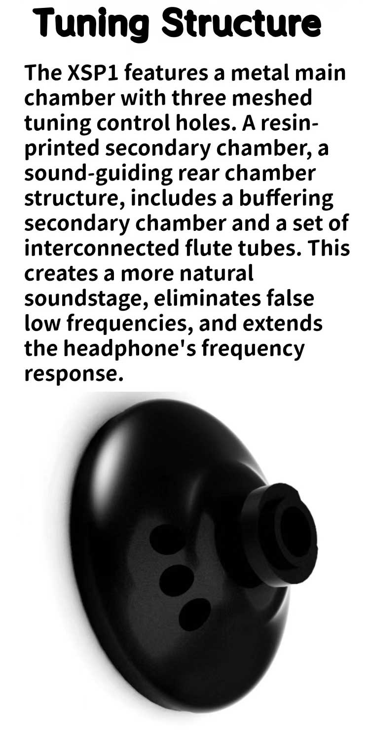 The XSPl features a metal mainchamber with three meshedtuning control holes. A resin-printed secondary chamber, asound-guiding rear chamberstructure,includes a bufferingsecondary chamber and a set ofinterconnected flute tubes. Thiscreates a more naturalsoundstage,eliminates falselow frequencies, and extendsthe headphone's frequencyresponse.