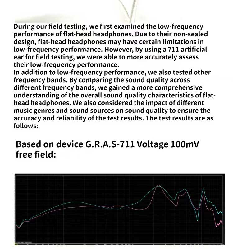 During our field testing, we first examined the low-frequencyperformance of flat-head headphones. Due to their non-sealeddesign,flat-head headphones may have certain limitations inlow-frequency performance. However, by using a 7l1 artificialear for field testing, we were able to more accurately assesstheir low-frequency performance.In addition to low-frequency performance, we also tested otherfrequency bands. By comparing the sound quality acrossdifferent frequency bands, we gained a more comprehensive understanding of the overall sound quality characteristics of flat-head headphones.We also considered the impact of differentmusic genres and sound sources on sound quality to ensure theaccuracy and reliability of the test results, The test results are asfollows: