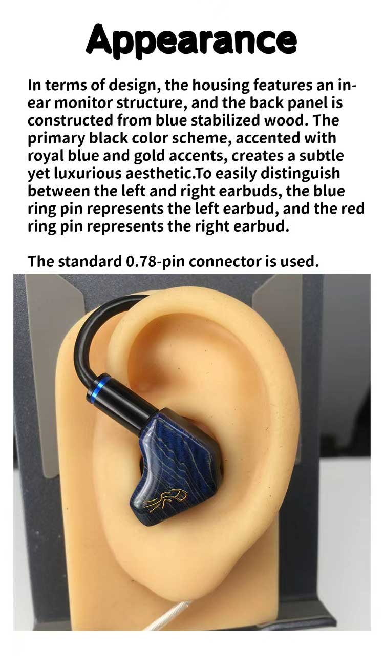 In terms of design, the housing features an in-ear monitor structure, and the back panel isconstructed from blue stabilized wood. Theprimary black color scheme, accented withroyal blue and gold accents, creates a subtleyet luxurious aesthetic.To easily distinguishbetween the left and right earbuds, the bluering pin represents the left earbud, and the redring pin represents the right earbud.