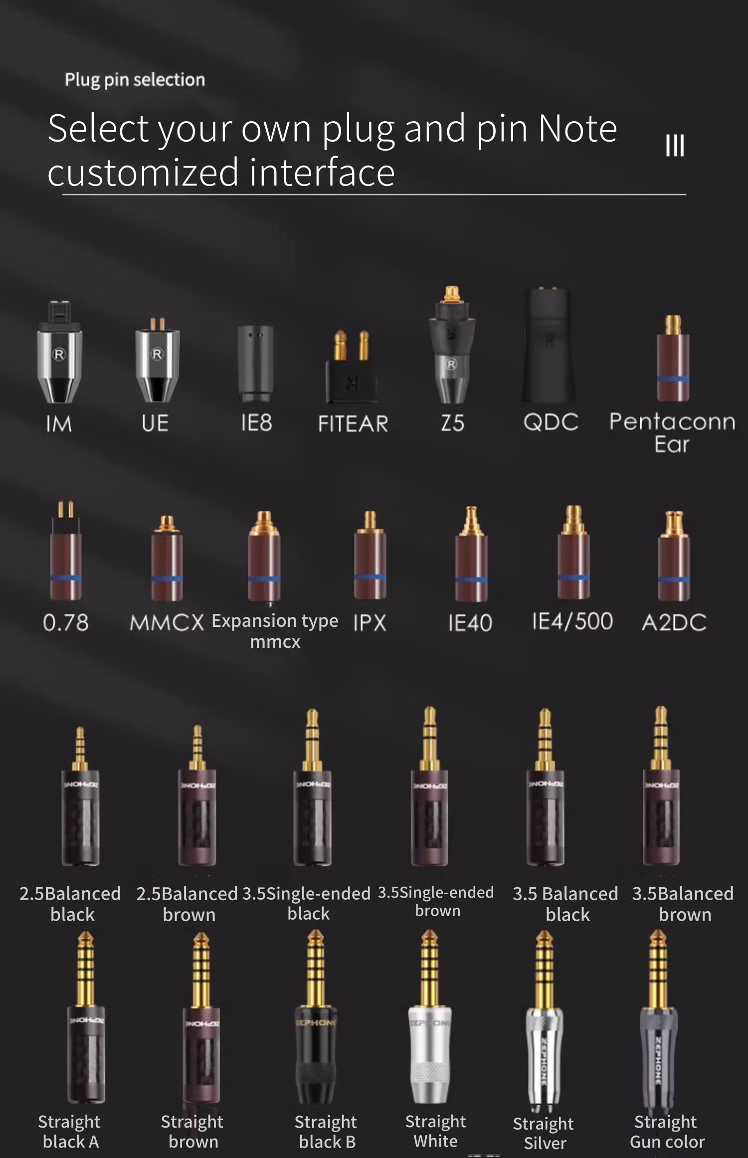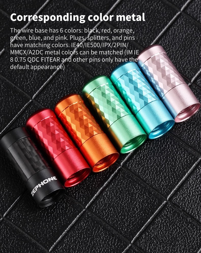 The wire base has 6 colors: black, red, orange,green, blue, and pink. Plugs, splitters, and pinshave matching colors.1E40/IE500/PX/2PIN/MMCX/A2DC metal colors can be matched (lM IE8 0.75 QDC FlTEAR and other pins only have thedefault appearance)