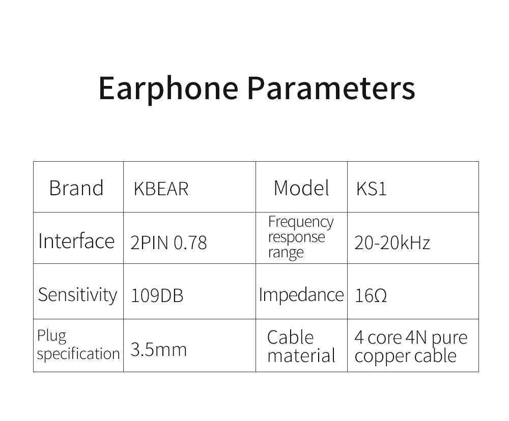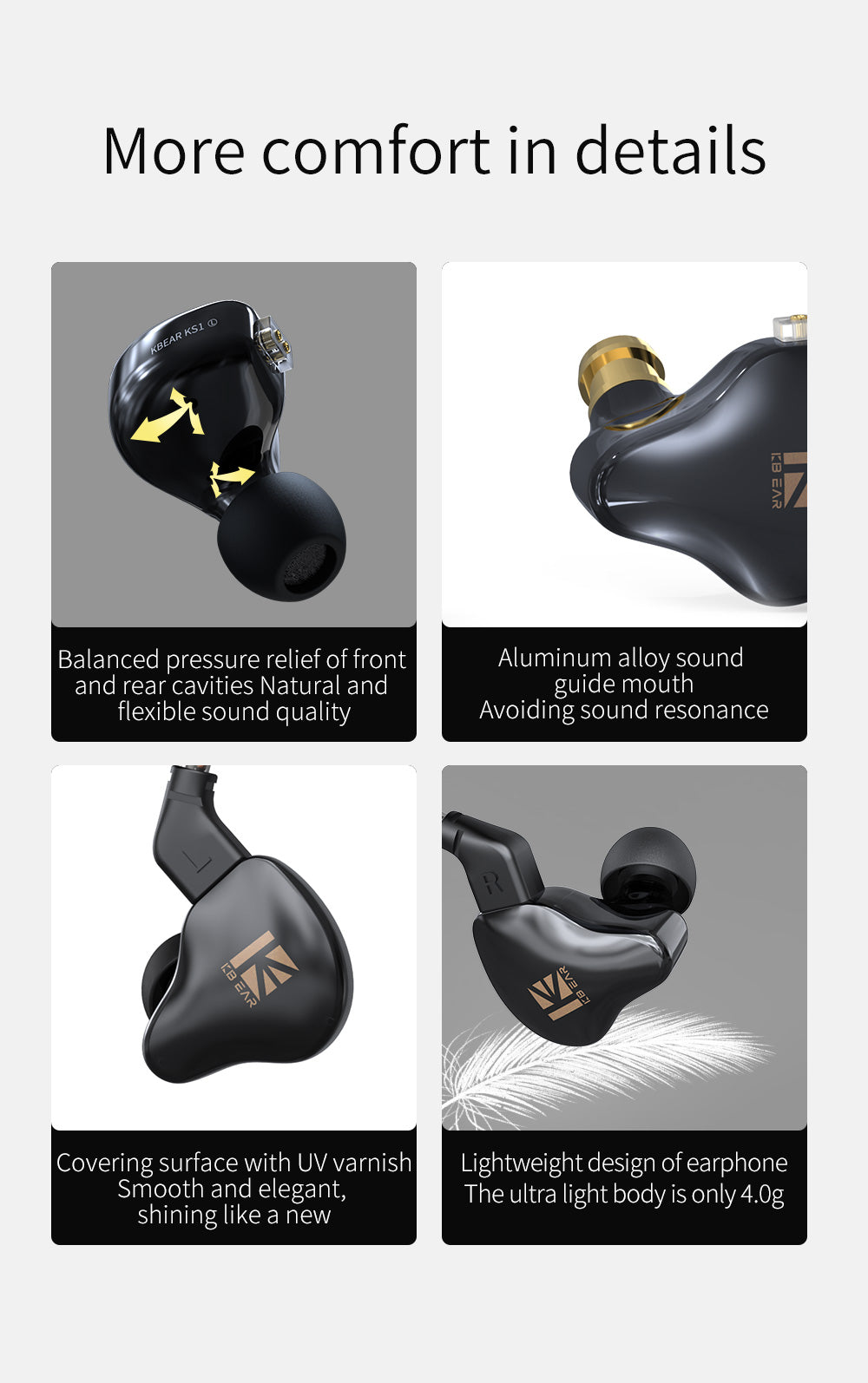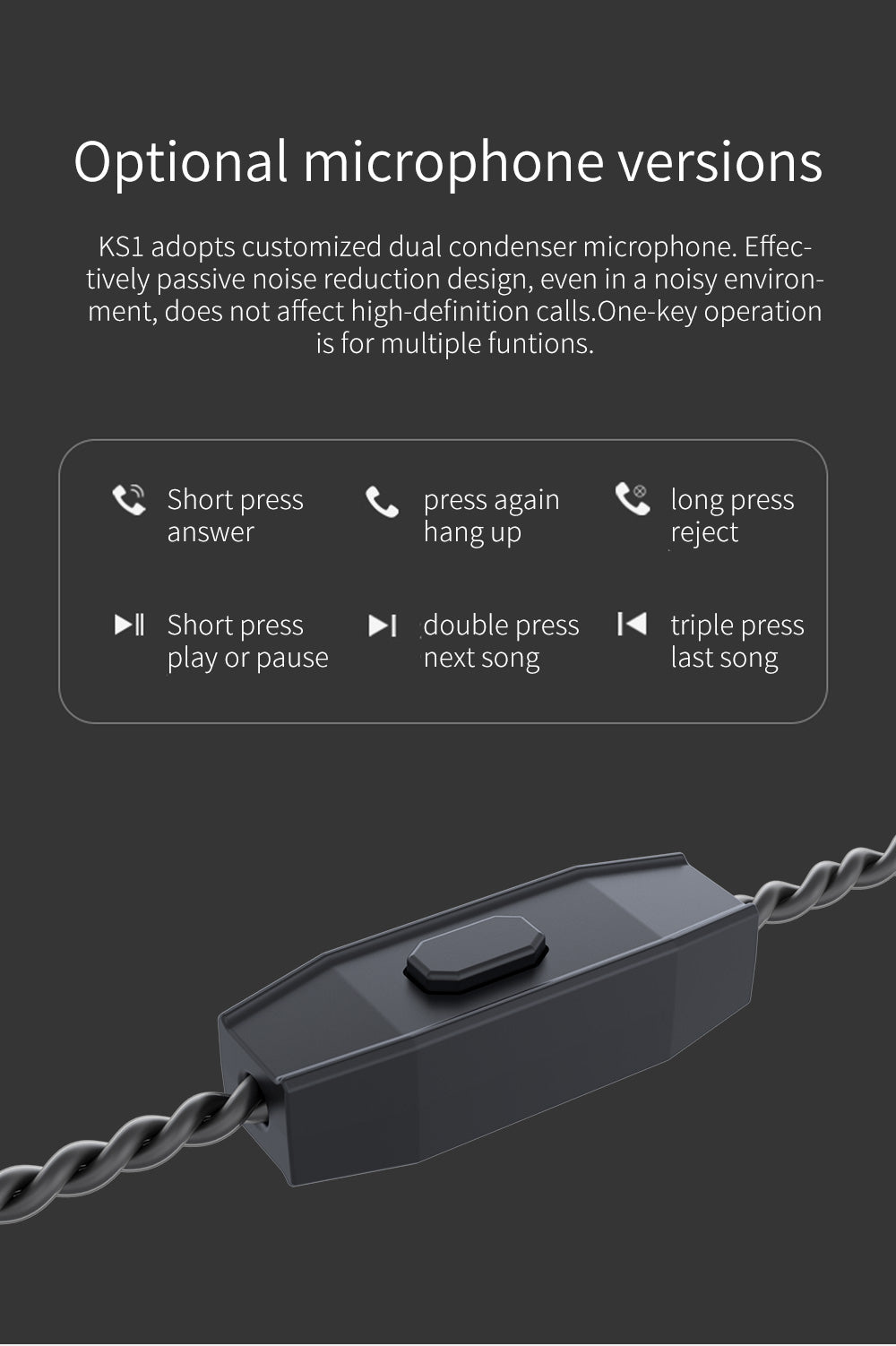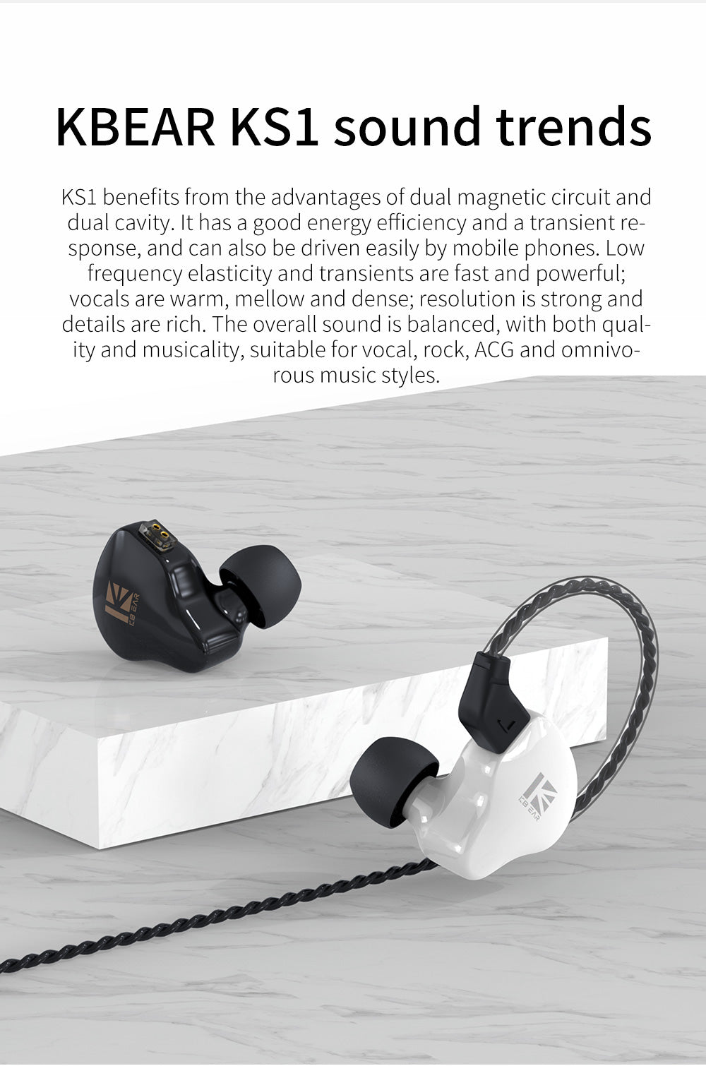 KS1 benefits from the advantages of dual magnetic circuit anddual cavity. it has a good energy efficiency and a transient re-sponse,and can also be driven easily by mobile phones. Lowfrequency elasticity and transients are fast and powerful;vocals are warm, mellow and dense; resolution is strong anddetails are rich. The overall sound is balanced, with both qual.ity and musicality, suitable for vocal, rock, ACG and omnivo-rous music styles.