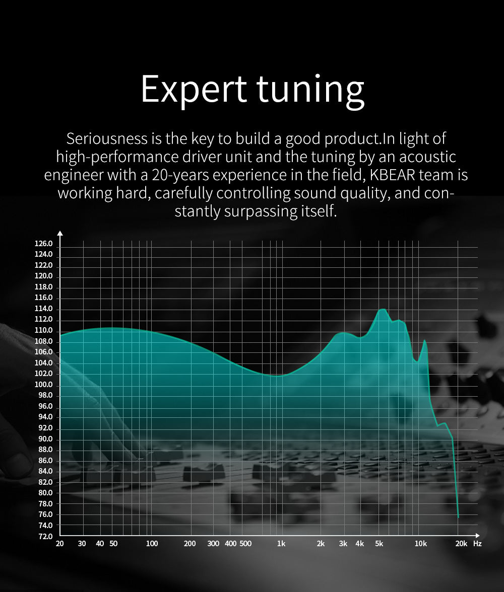 Seriousness is the key to build a good product.In light ofhigh-performance driver unit and the tuning by an acousticengineer with a 20-years experience in the field, KBEAR team isworking hard, carefully controlling sound quality, and con-stantly surpassing itself.