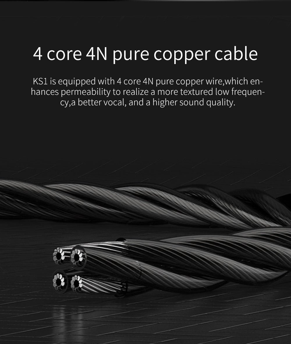 KS1 is equipped with 4 core 4N pure copper wire,which en-hances permeability to realize a more textured low frequen-cy,a better vocal, and a higher sound quality.