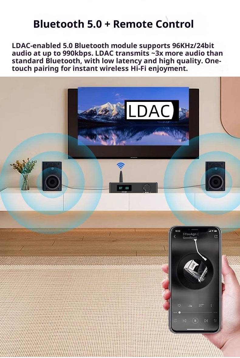 LDAC-enabled 5.0 Bluetooth module supports 96KHz/24bitaudio at up to 990kbps.LDAC transmits ~3x more audio thanstandard Bluetooth,with low latency and high quality. One.touch pairing for instant wireless Hi-Fi enjoyment.