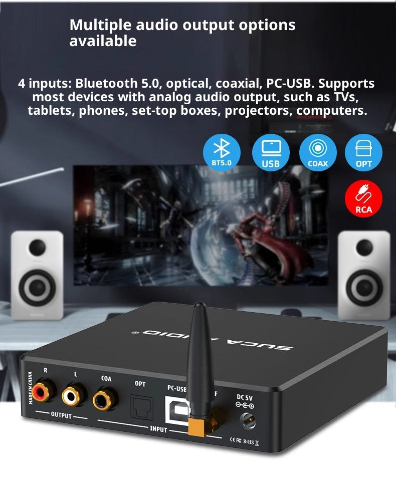 4 inputs: Bluetooth 5.0,optical, coaxial, Pc-UsB. Supportsmost devices with analog audio output, such as TVs,tablets,phones, set-top boxes, projectors, computers.